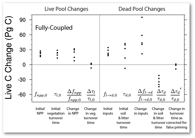We developed a theoretical framework for separating inputs and outputs, and applied it to CMIP5 ESMs. We identified key areas where these terms interact, in particular identifying a process that we call “false priming” that is an apparent interaction between productivity and soil decomposition, and quantified processes that most strongly govern uncertainty in carbon cycle feedbacks.