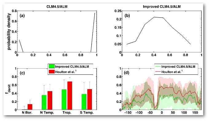 - As shown in the upper left panel, the current versions of ALM and CLM4.5 poorly represent the gaseous proportion on nitrogen losses (fdenit).